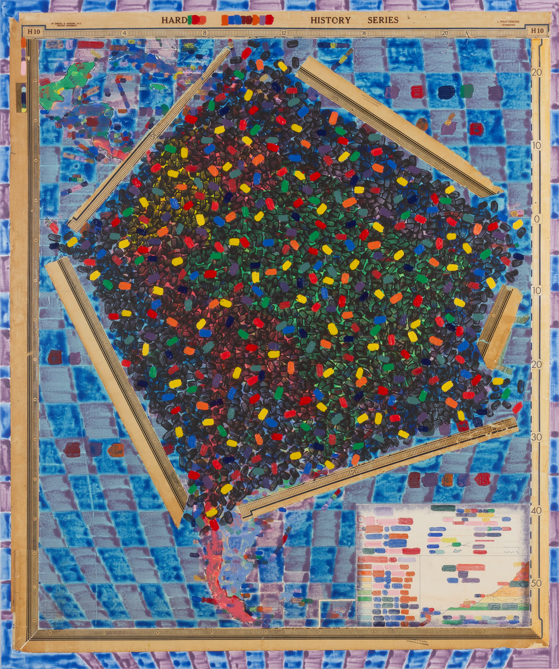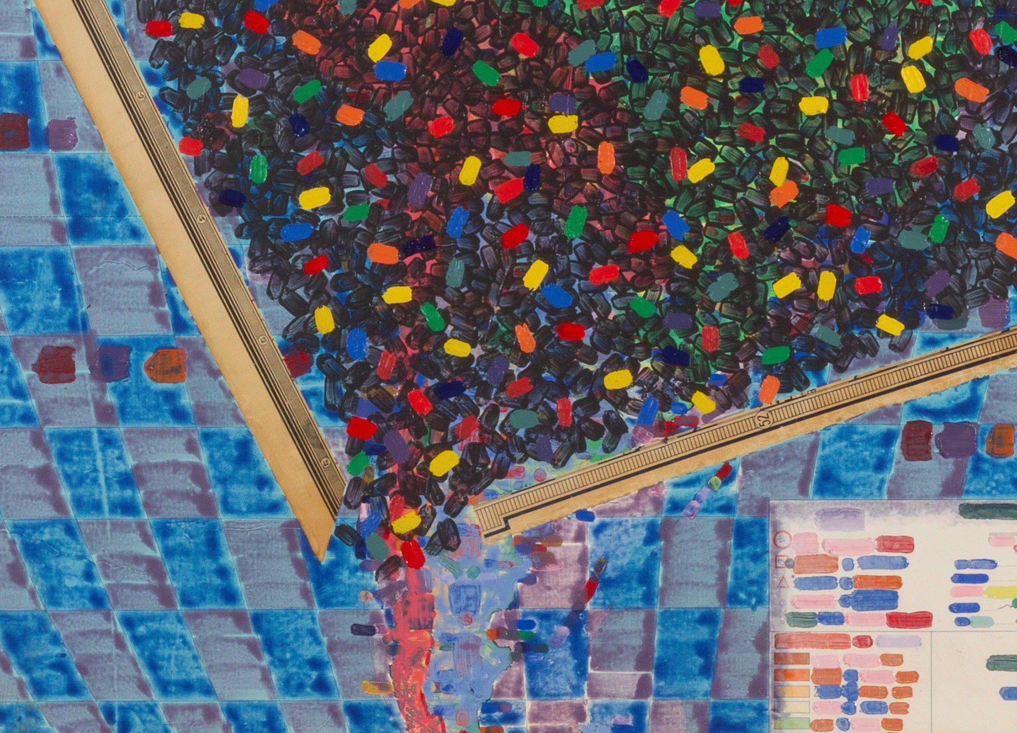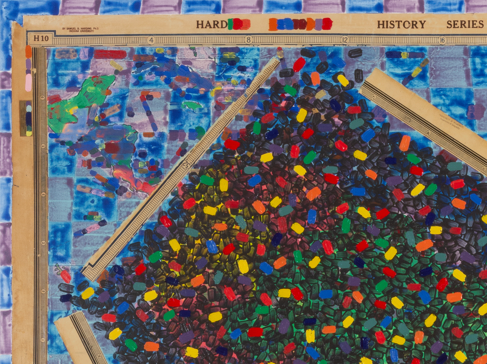 Amazon Region with Borders (with the estimated number of nations and tribes at European contact marked in black, and the estimated current number marked in colors), 2020, acrylic on cut-and-pasted printed paper on board, 55 x 46 inches