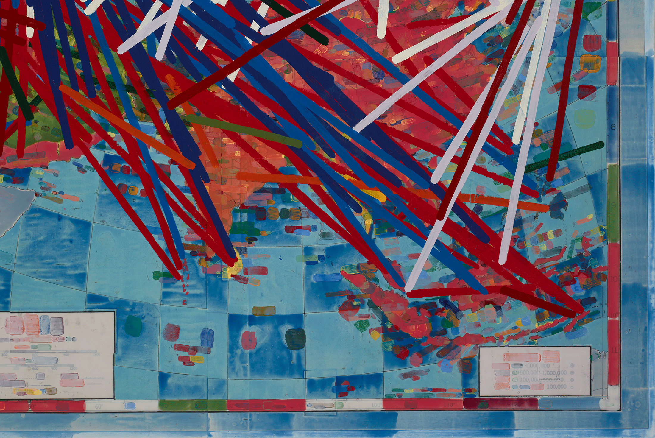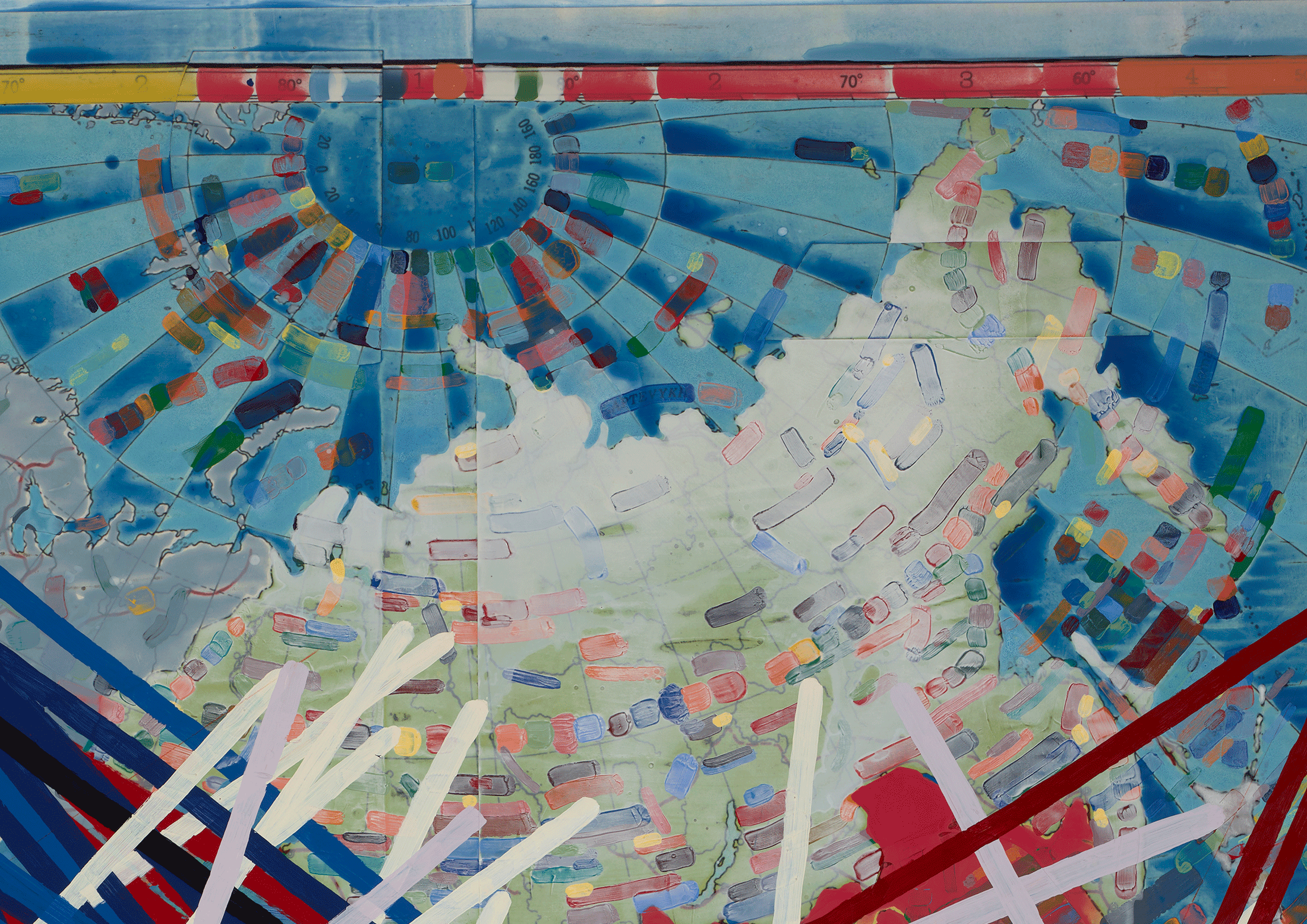 Colonizing in Asia Since 1400, 2021-23, acrylic, ink, and color pencil on cut- and-pasted printed paper on board, 74 x 71 x 2 ¼ inches