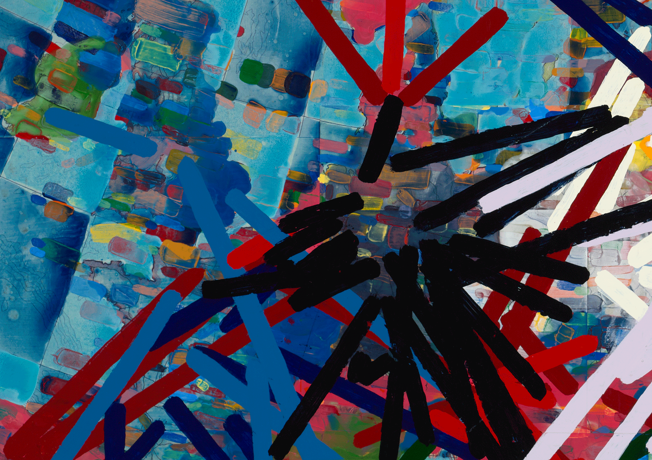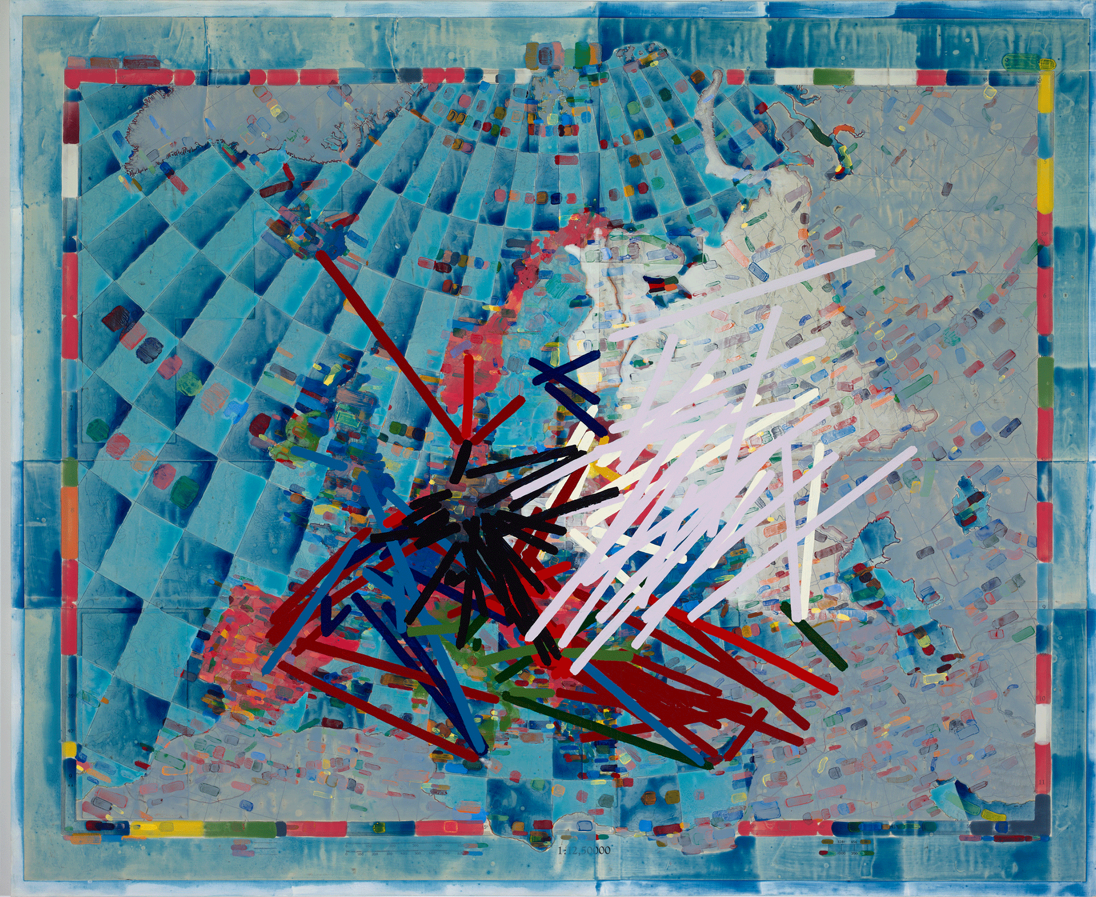 Colonizing in Europe Since 1400, 2021-23, acrylic, ink, and color pencil on cut- and-pasted printed paper on board, 61 x 74 x 2 ¼ inches