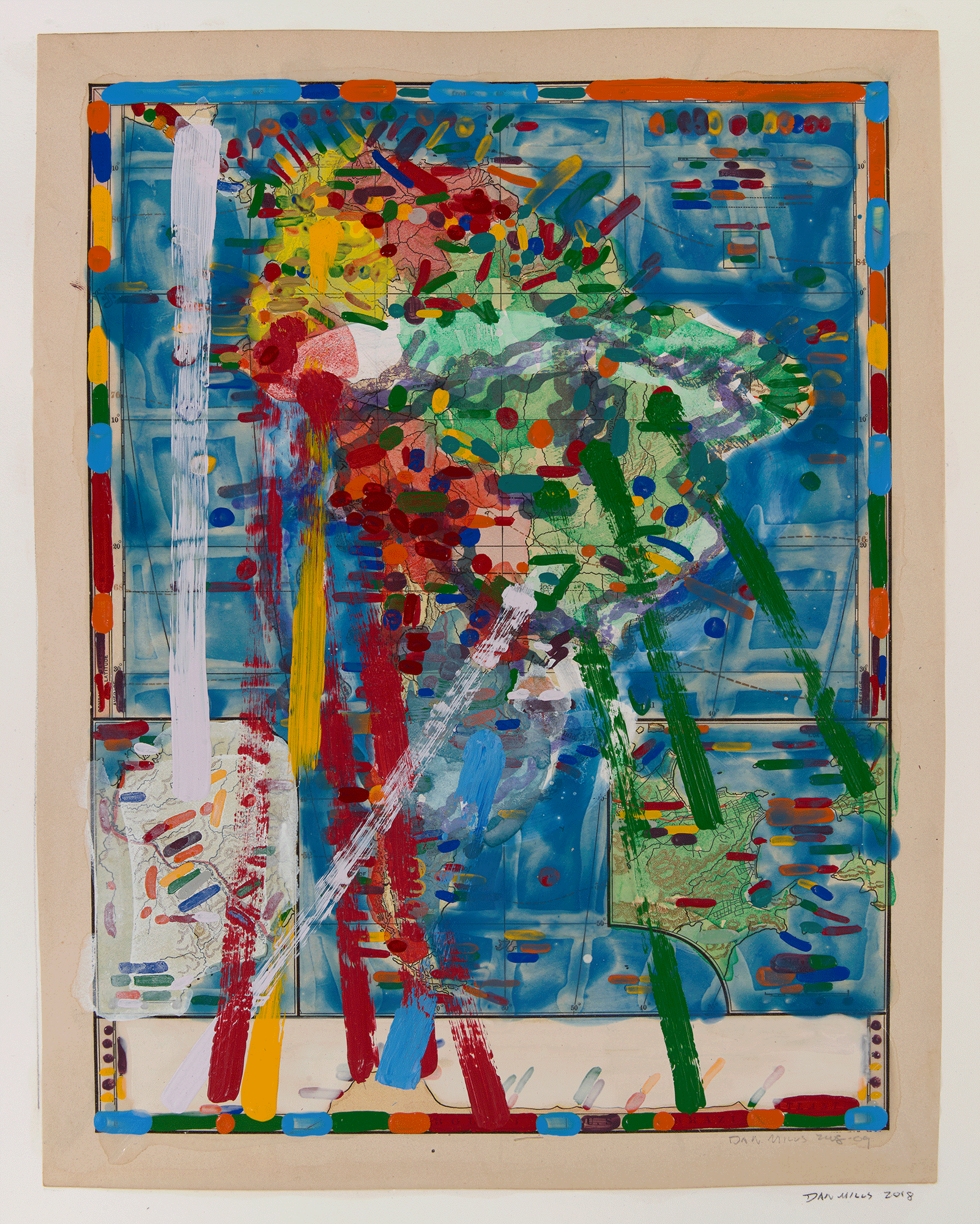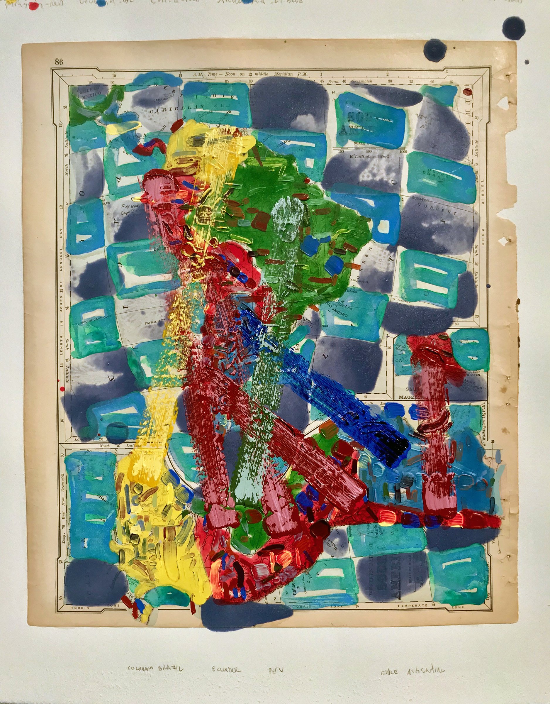 Contest - South America (with nationalist colors), 2018, acrylic, ink on printed paper, 12 x 10 inches