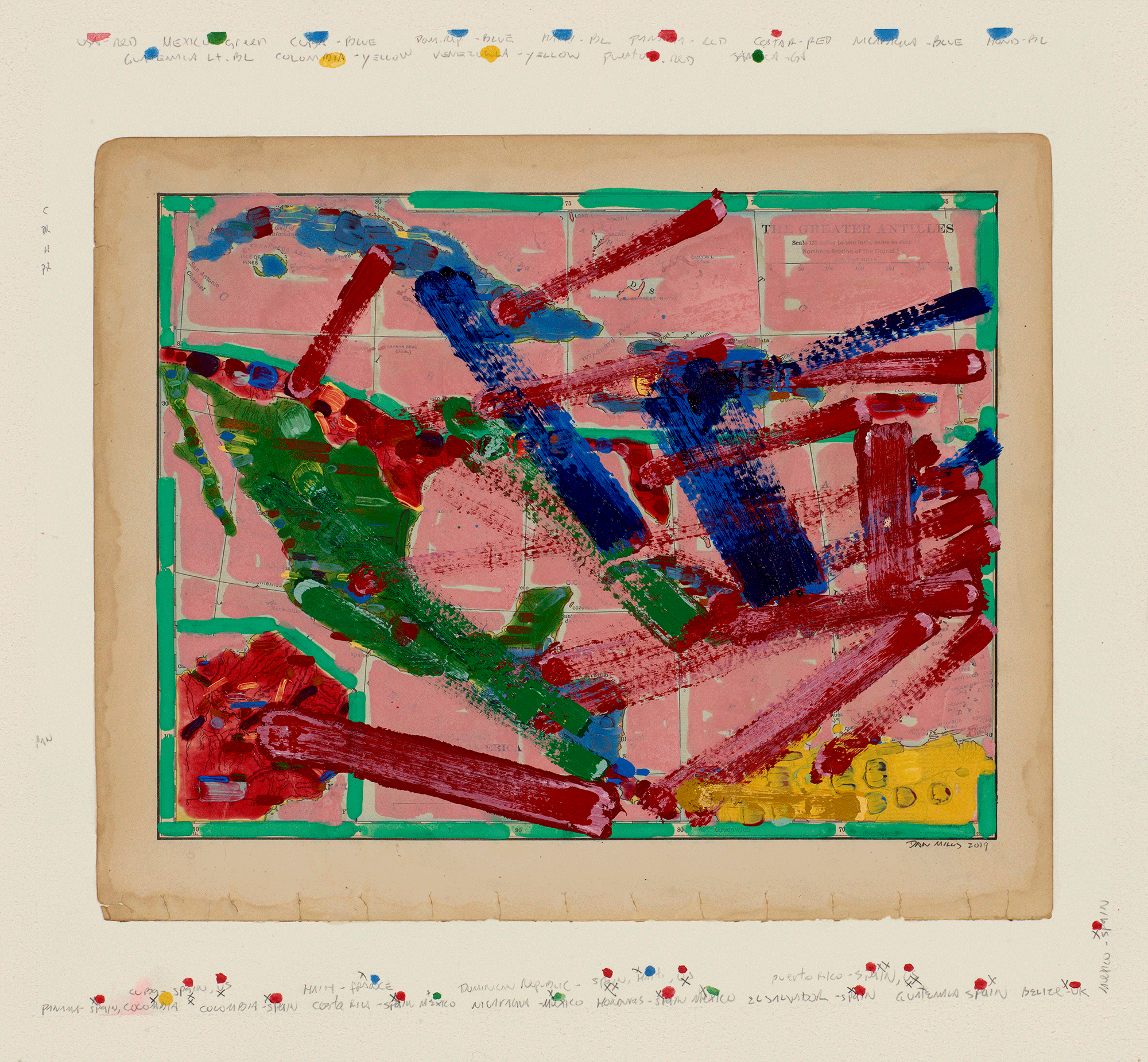 Contest - Central America and Surrounds (with nationalist colors and including the colonial era), 2018-19, acrylic, watercolor, ink on printed paper, 11 ½ x 14 ½ inches