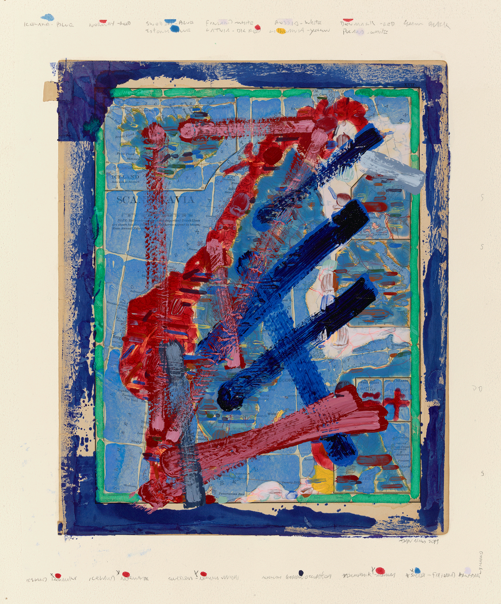 Contest - Scandinavia (with nationalist colors and including colonial incursions and excursions), 2018, acrylic, watercolor, ink on printed paper, 12 ¼ x 10 inches