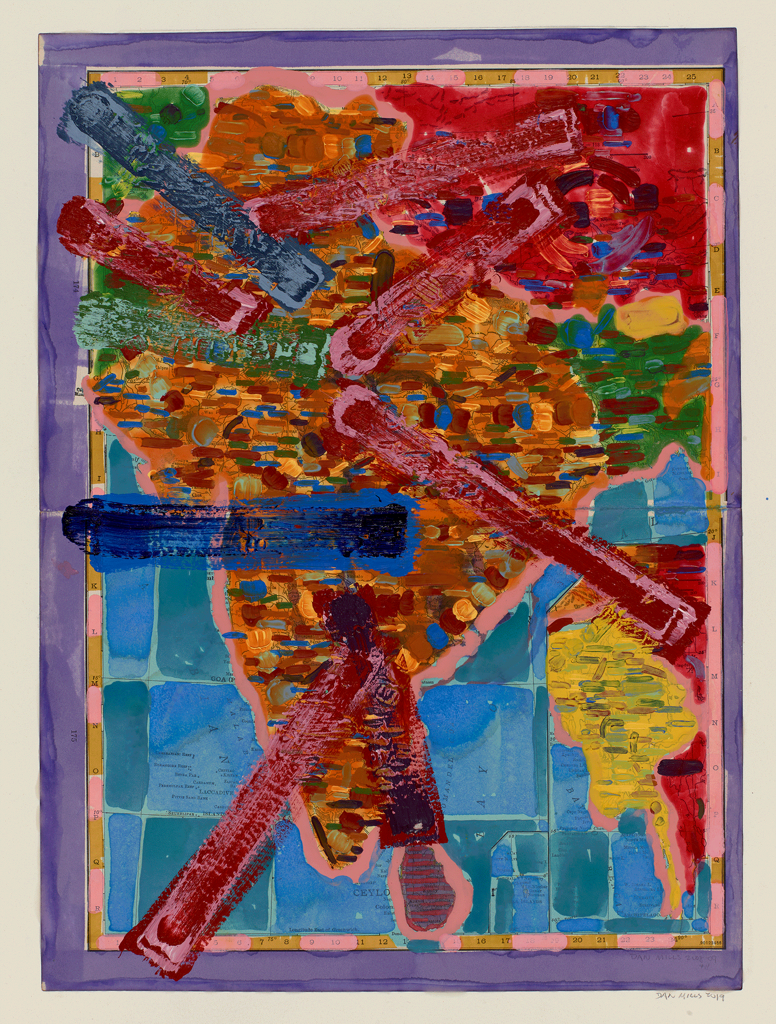 Contest - India and Surrounds (with nationalist colors and including colonial incursions and excursions since 1878), 2018, acrylic, watercolor, ink on printed paper, 13 ¾ x 10 inches