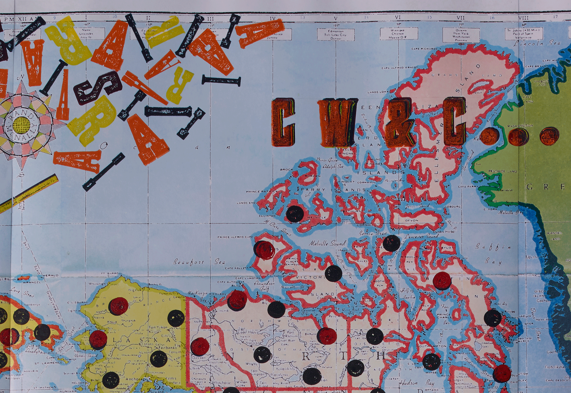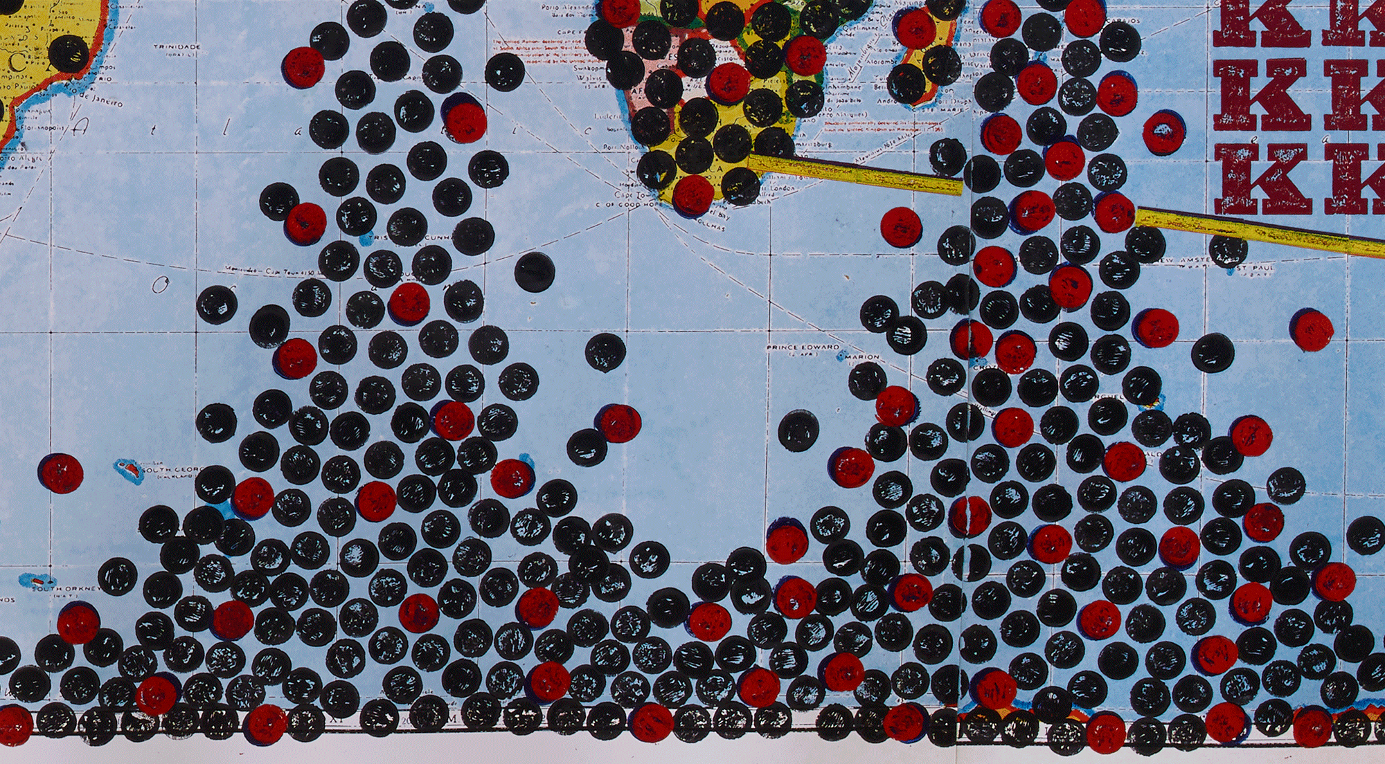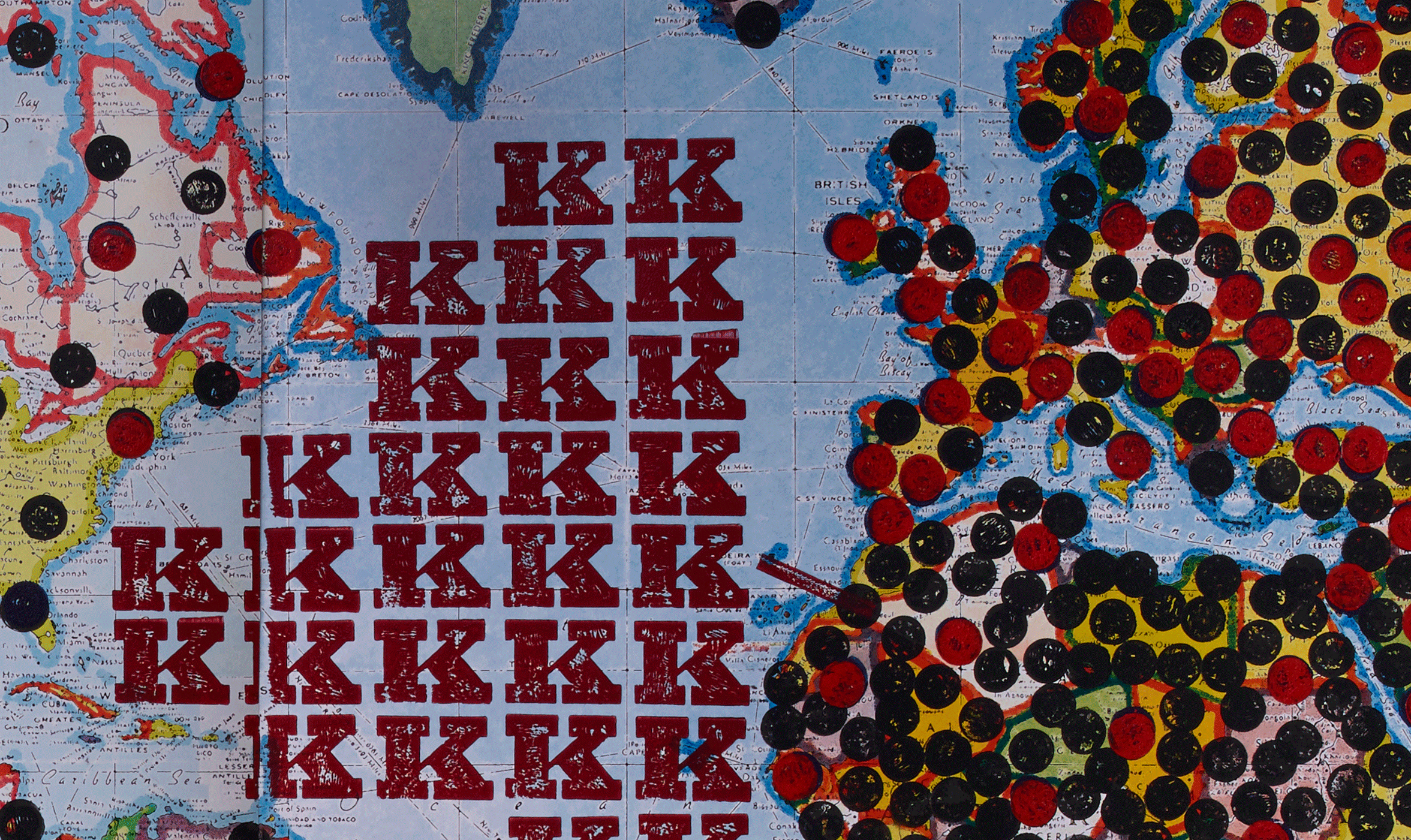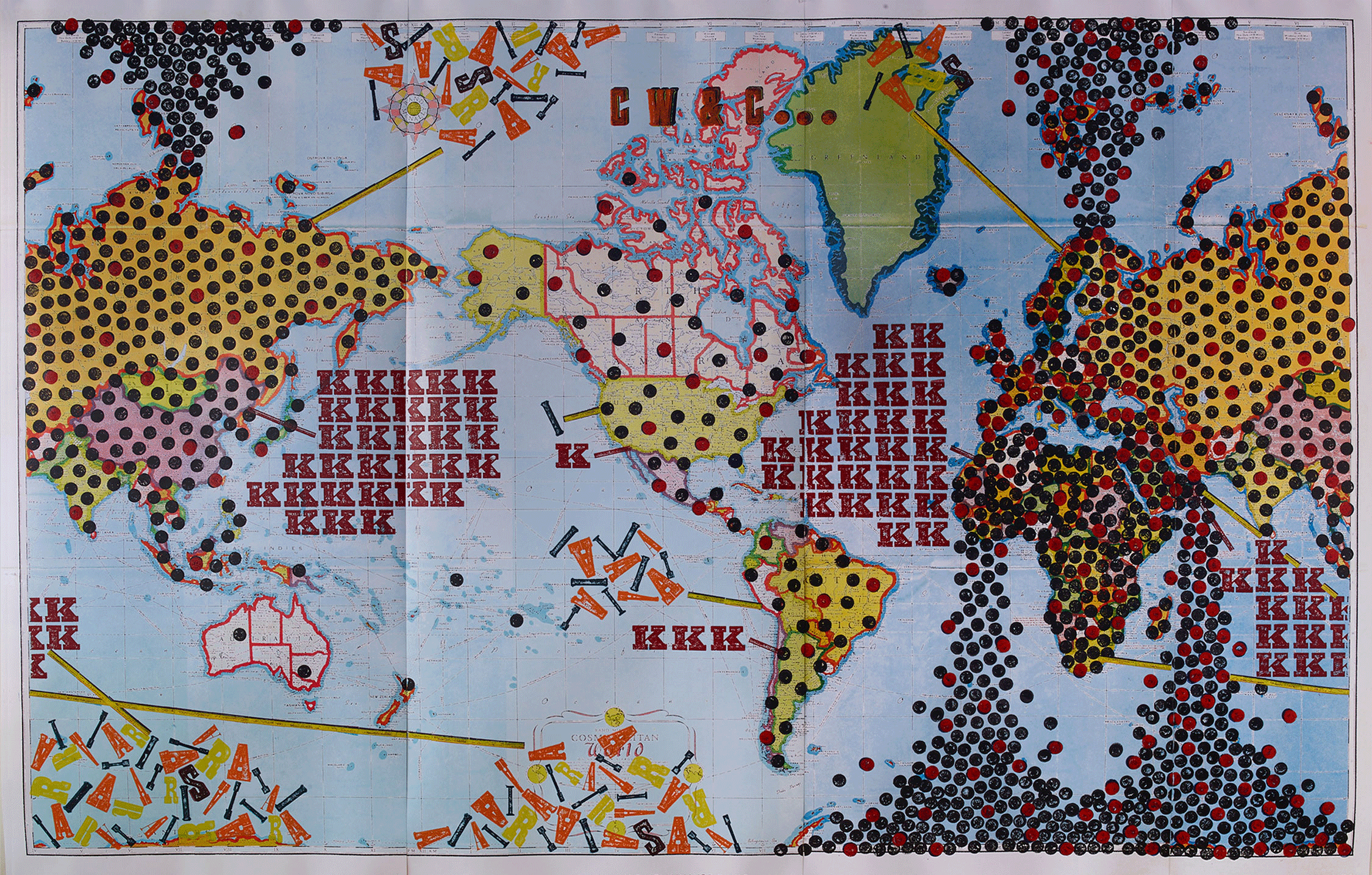 Current Wars & Conflicts… (with, by continent, belligerent and supporter groups marked with black and red circles respectively, and Asylum Seekers, Internally Displaced, Refugees, and Stateless marked with a letter for every million, and killed marked with letters for every 250k), 2017, ink on digitally reworked printed map on corrugated aluminum, 95 x 148 7/8 inches