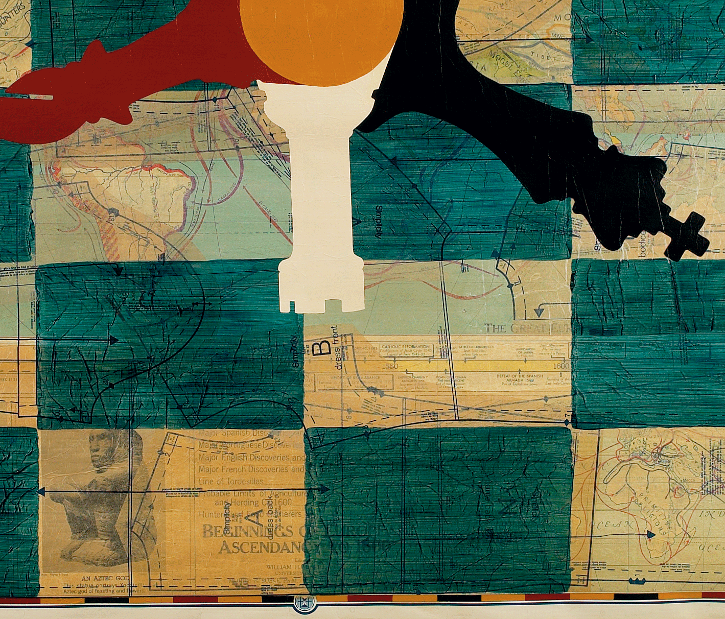 Legend, 2000, acrylic, cut-and-pasted printed paper collage, 33 3/4 x 47 x 1 inches. Collection of Mount Holyoke College Art Museum