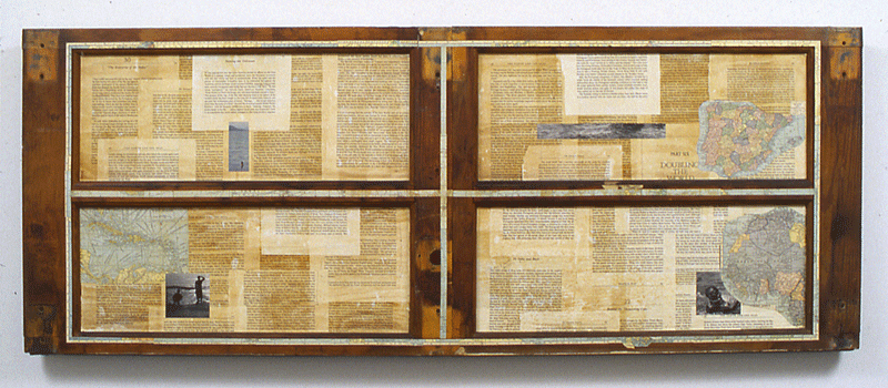 (Re) View (1492), 1992-93, cut-and-pasted printed paper on wood, 20 1/2 x 52 x 2 1/4 inches