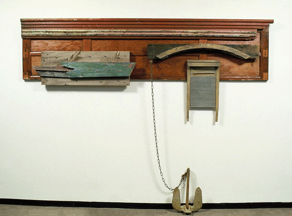 Anchored, 1992-93, mixed media construction, 39 1/2 x 97 x 6 inches + anchor & chain.
