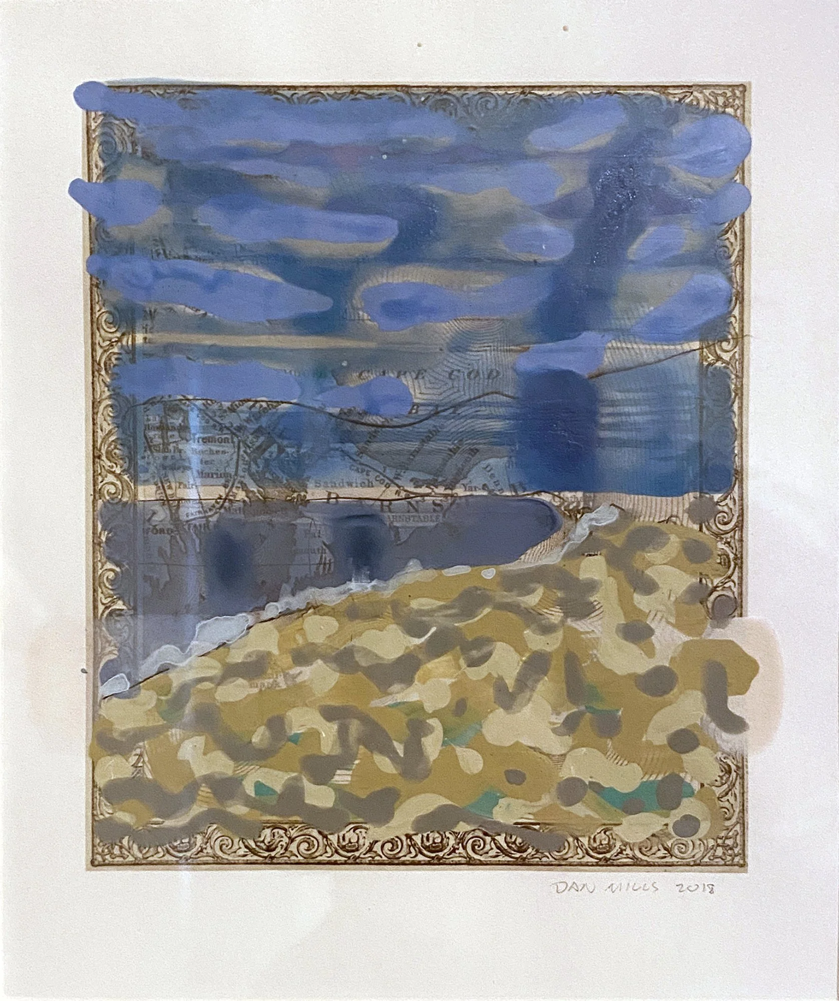 These abstracted images are painted on top of reproductions of historic maps of Cape Cod. Map information reveals itself within the paintings suggesting water, beach, and sky.
