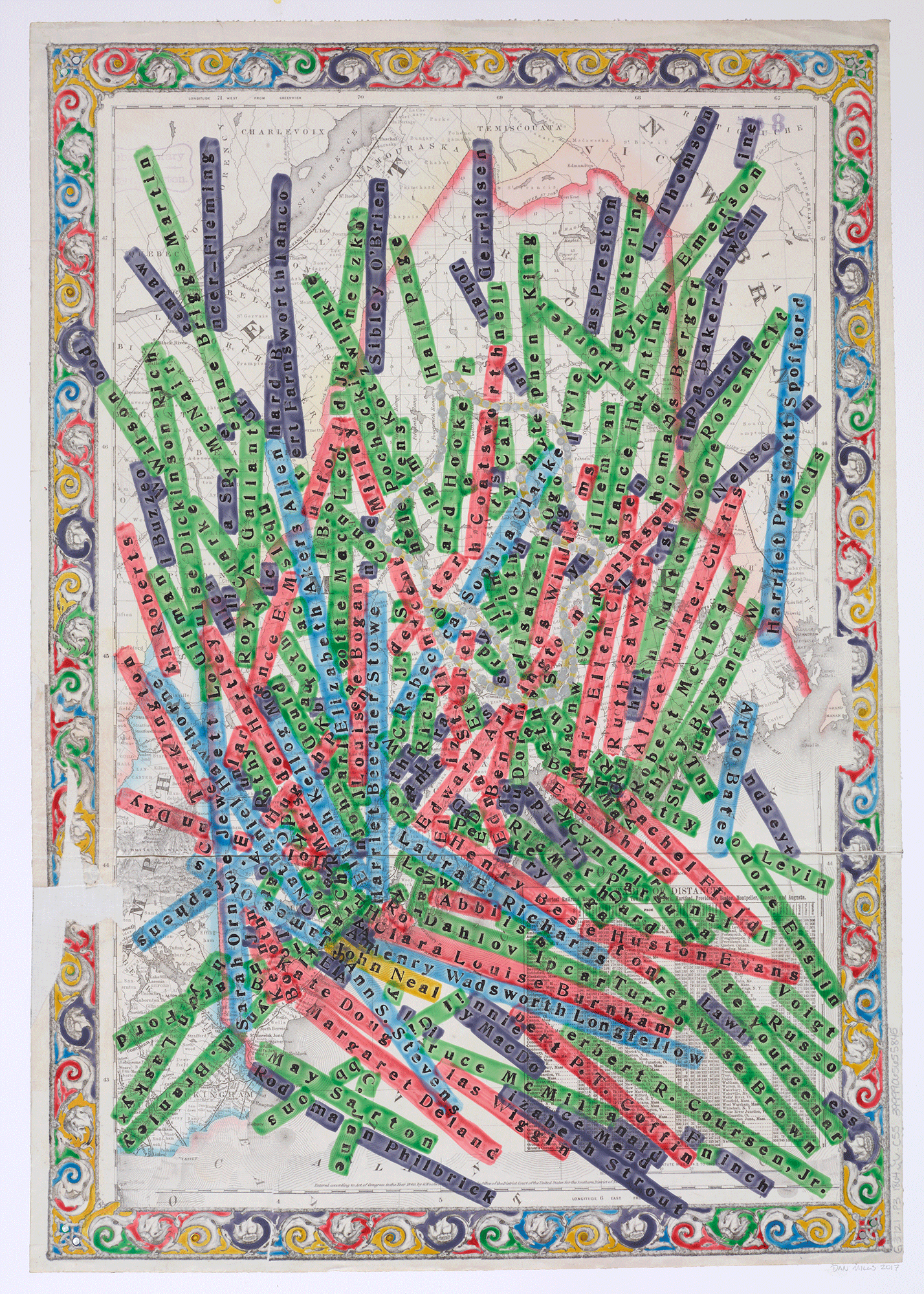 Some Maine Writers (one hundred and two Maine writers, color coded by half century, with the first letter of their name near their locale, and Thoreau's journeys in silver and gold), 2017, acrylic, ink, metallic paint on digitally altered map, 37 1/4 x 26 inches