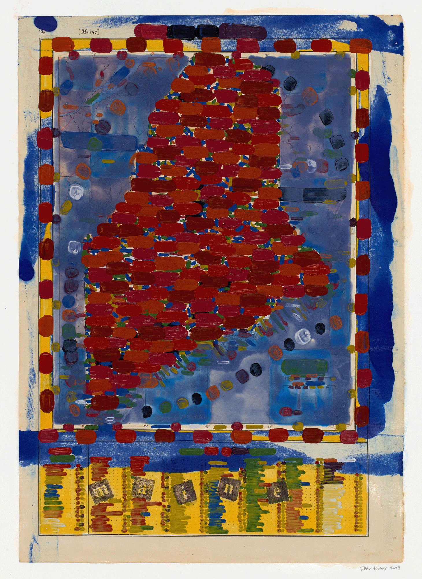 What’s in a Name? Maine (with the number of major geographic features named after indigenous people & words marked with red), 2018, acrylic, ink on printed paper, 15 1/2 x 10 3/4 inches.