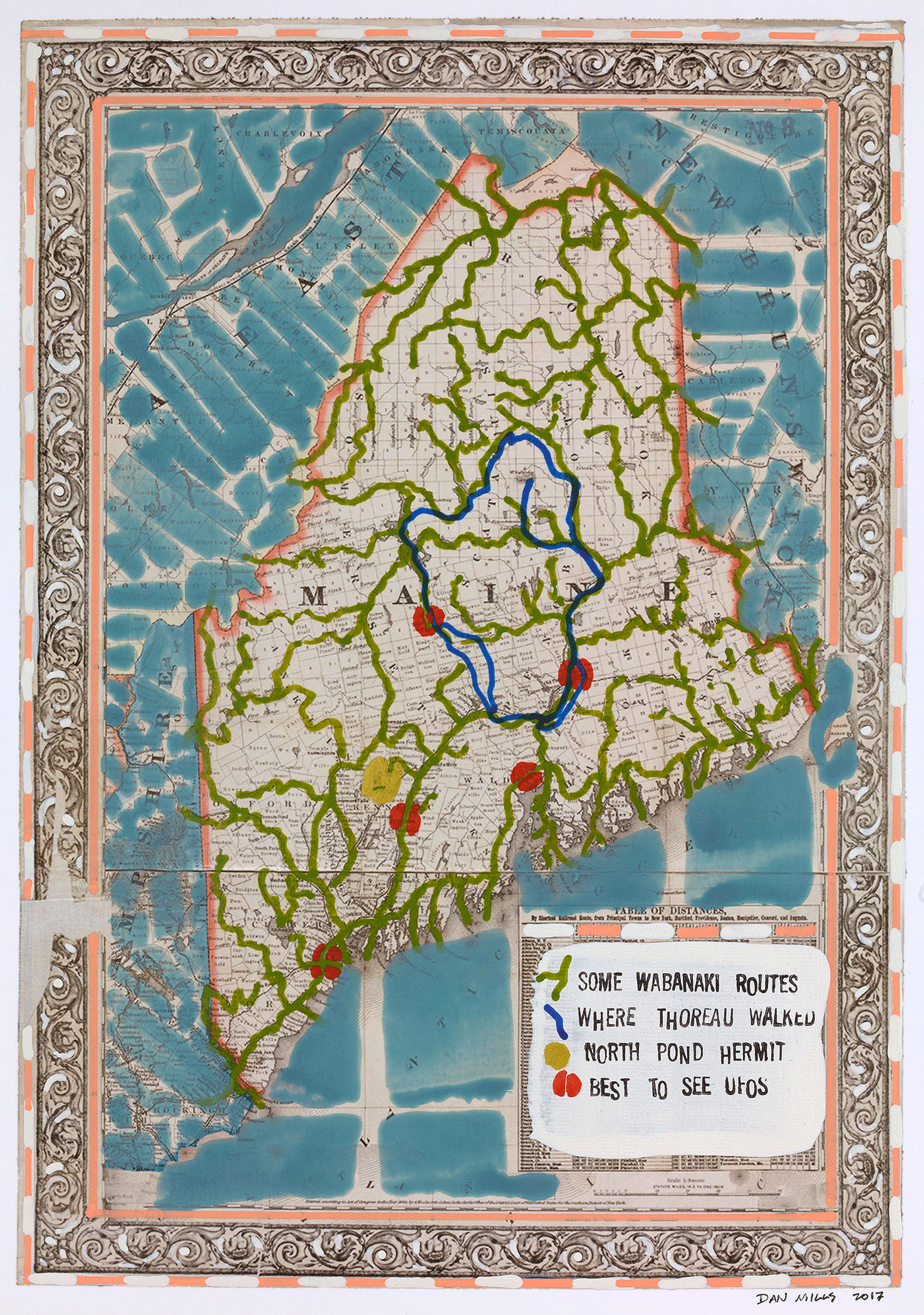 Hermit, Thoreau, UFOs, and Wabanaki Route Information, 2017, acrylic, gouache, ink on digitally altered map, 14 1/4 x 10 inches.
