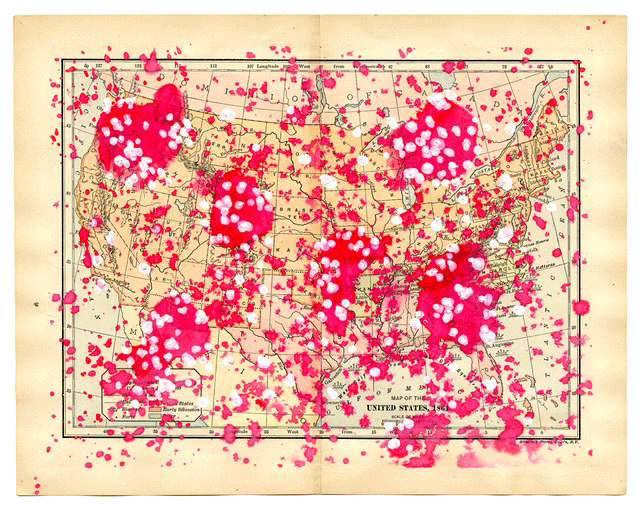 Pox (Map of North America in the 15th Century), 2010, watercolor on printed paper, 11 x 15 inches