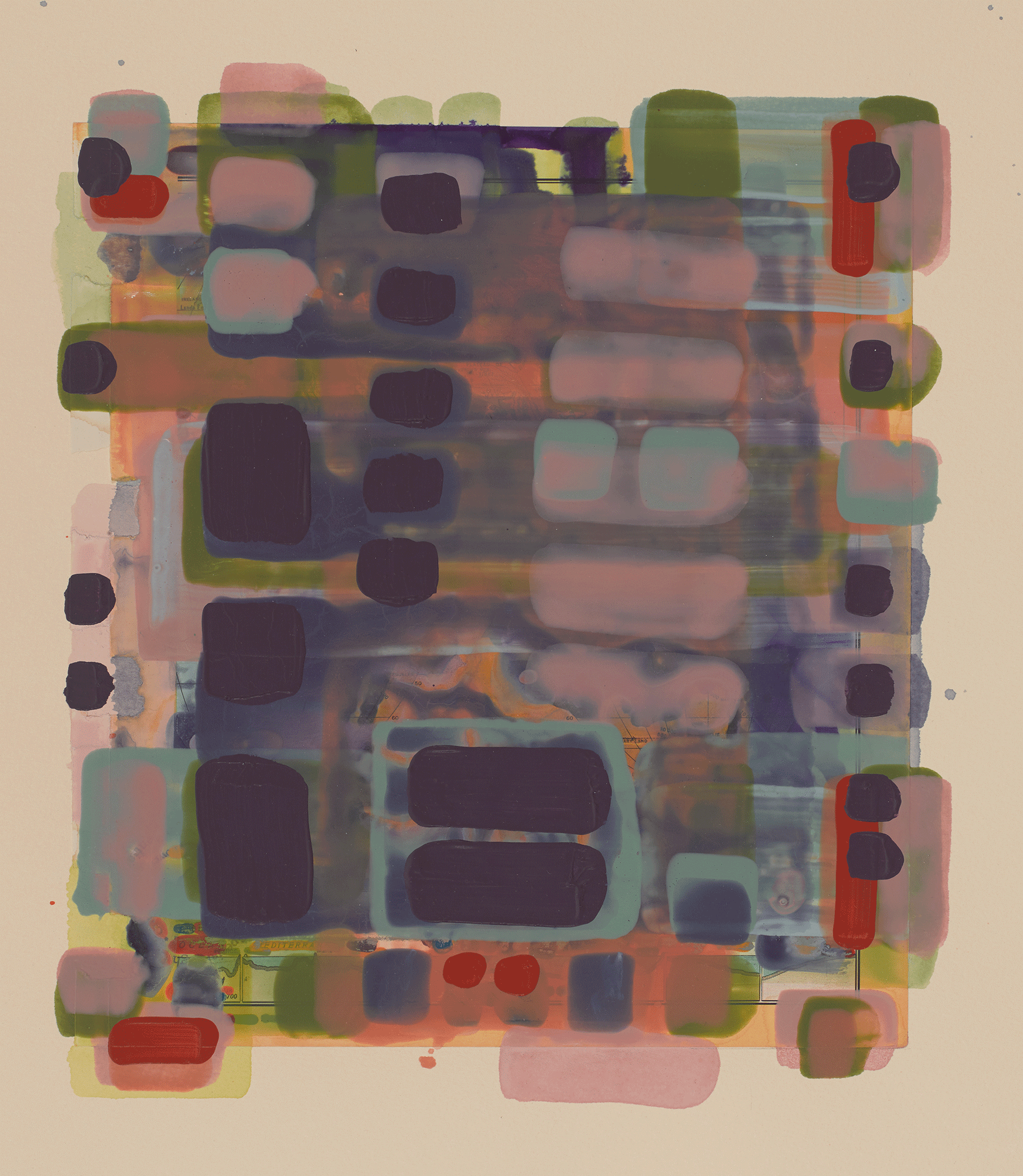 Outer Cape and Maine Overpaintings continue to explore conceptual and material ideas of “Earlier Overpaintings”: the idea of redacting naming and other words from maps to eliminate textual information; visually and technically exploring painting out this information with different paints, paint thicknesses, opacities, &c.; and experimenting with painting washes of color over map information and areas thickly overpainted.