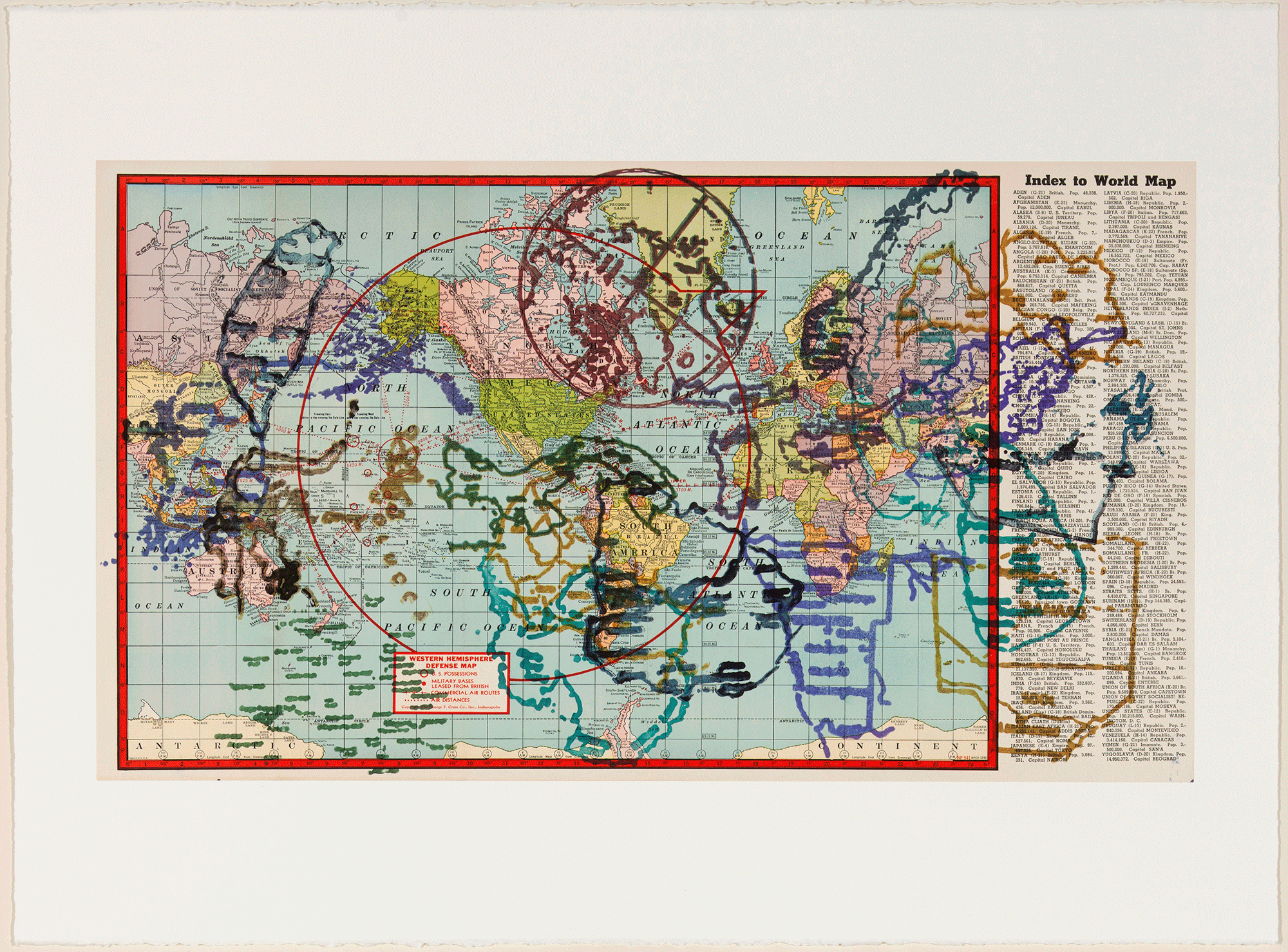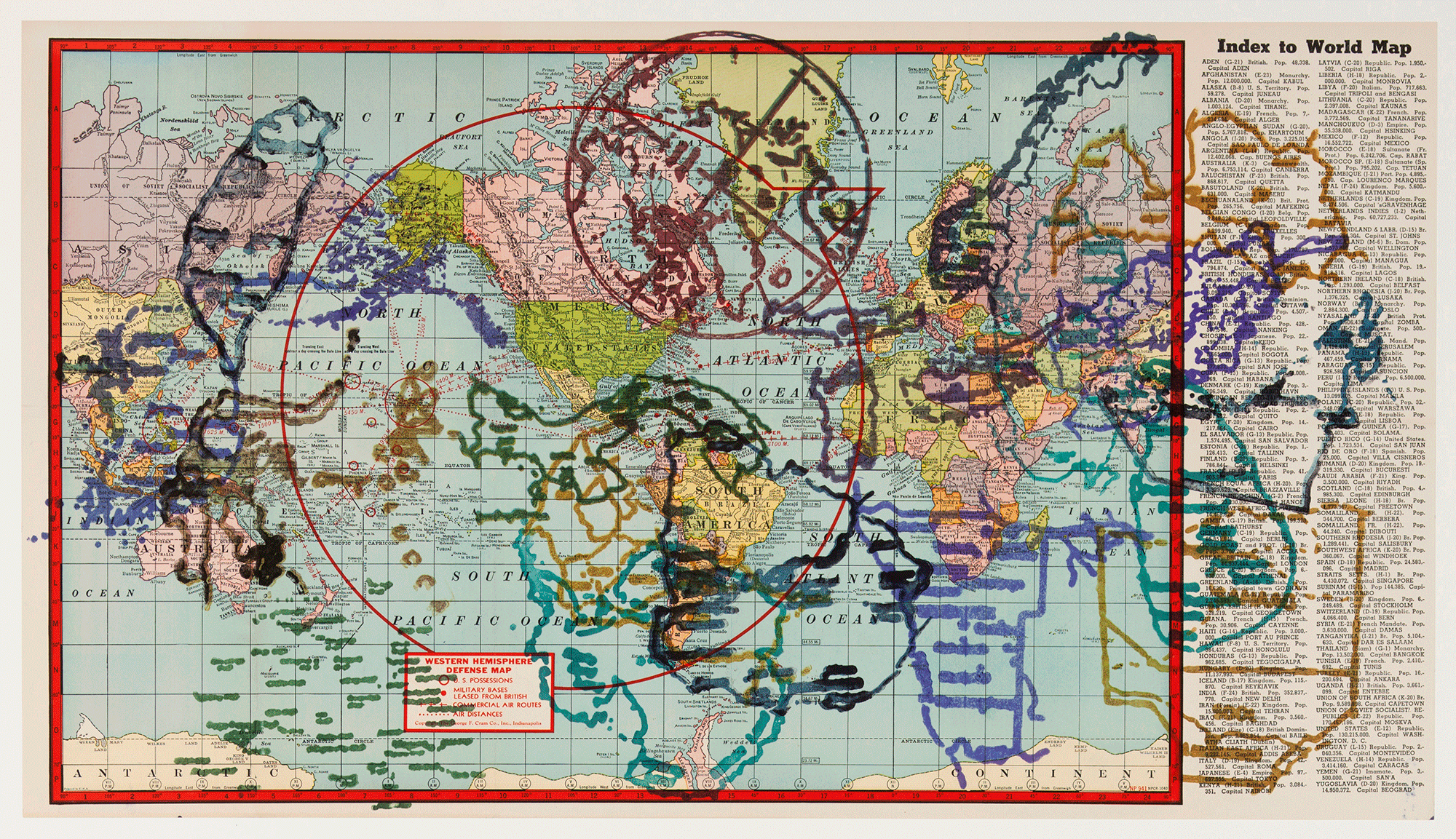 USE The World, Western Hemisphere Defense Map, 2009-13, custom rubber stamps on printed paper (unique), 22 1/2 x 30 inches
