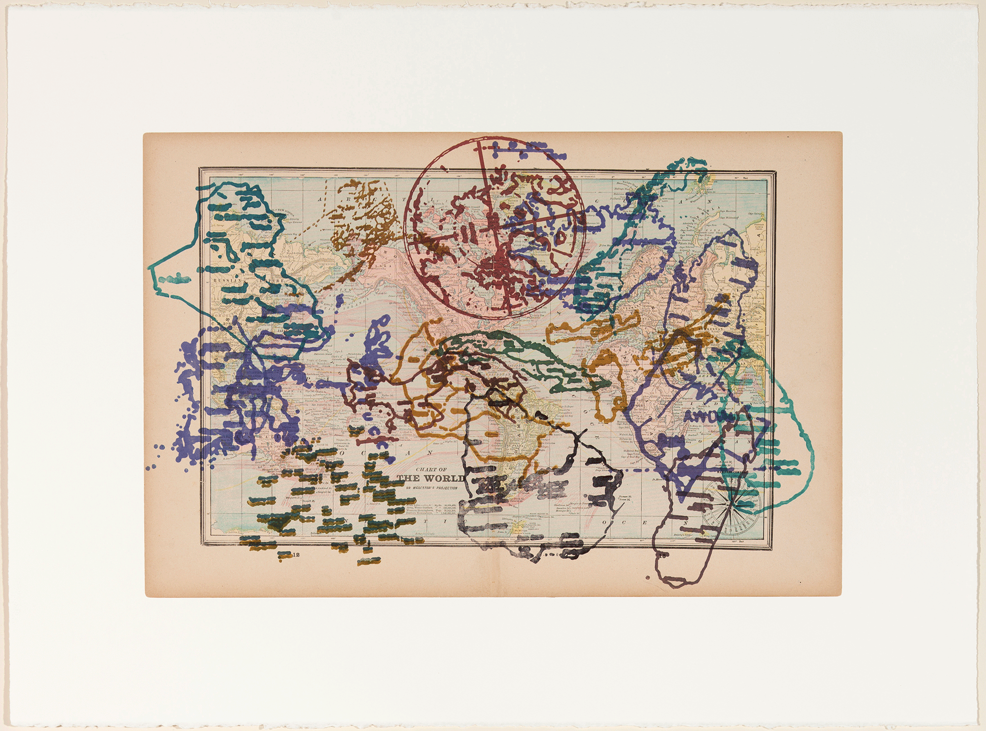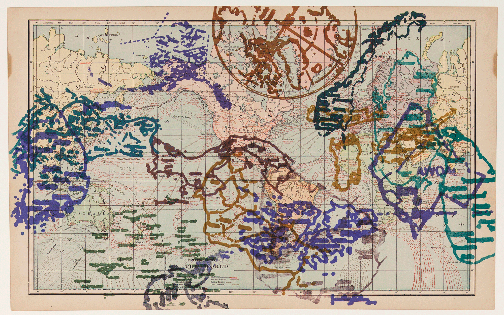 USE The World, Mercatur's Projection, 2009-13, custom rubber stamps on printed paper (unique), 22 1/2 x 30 inches