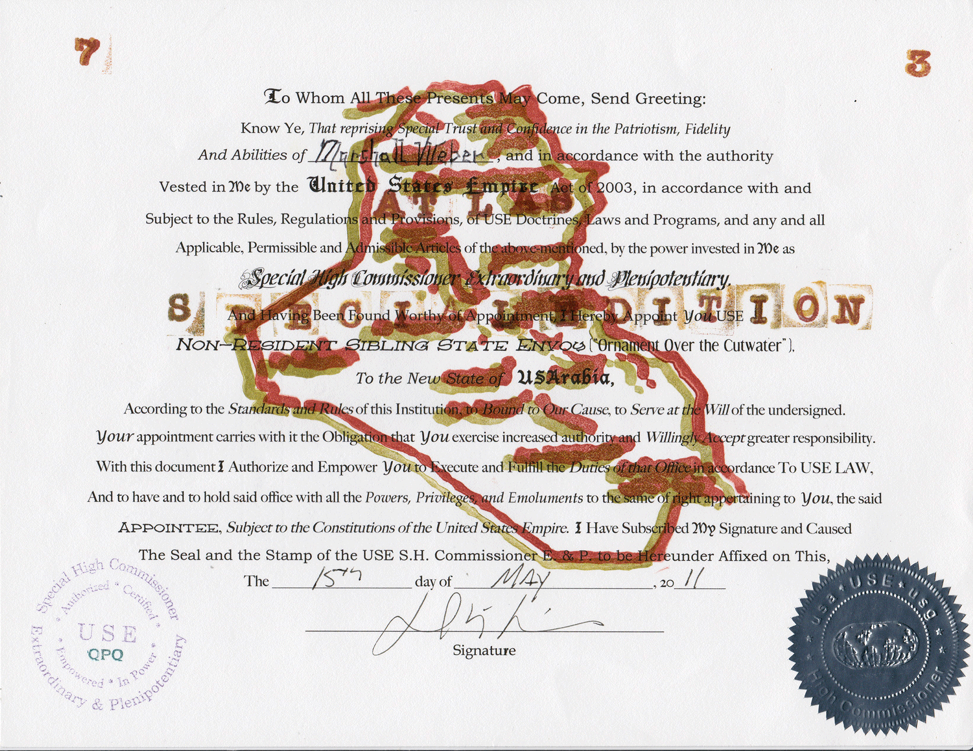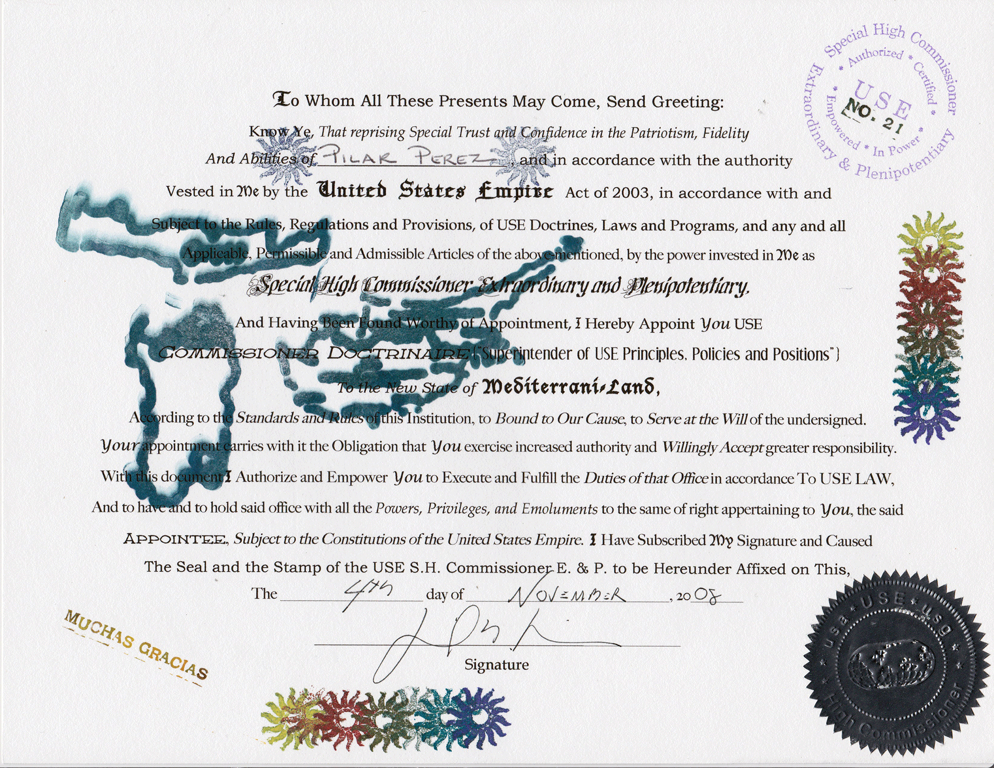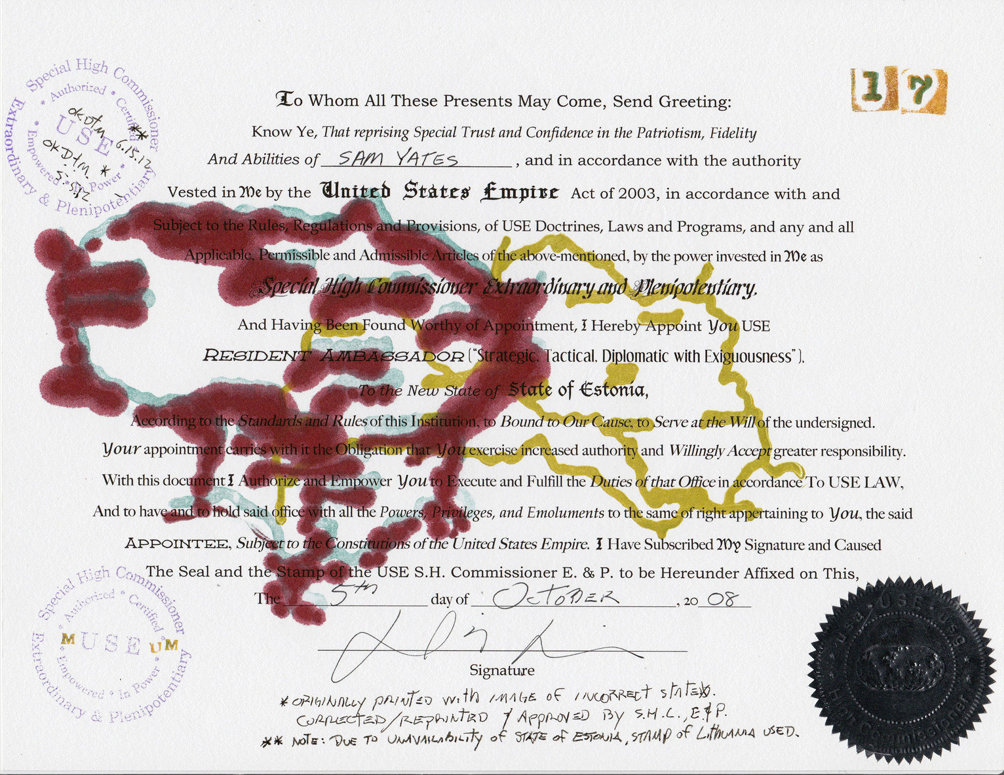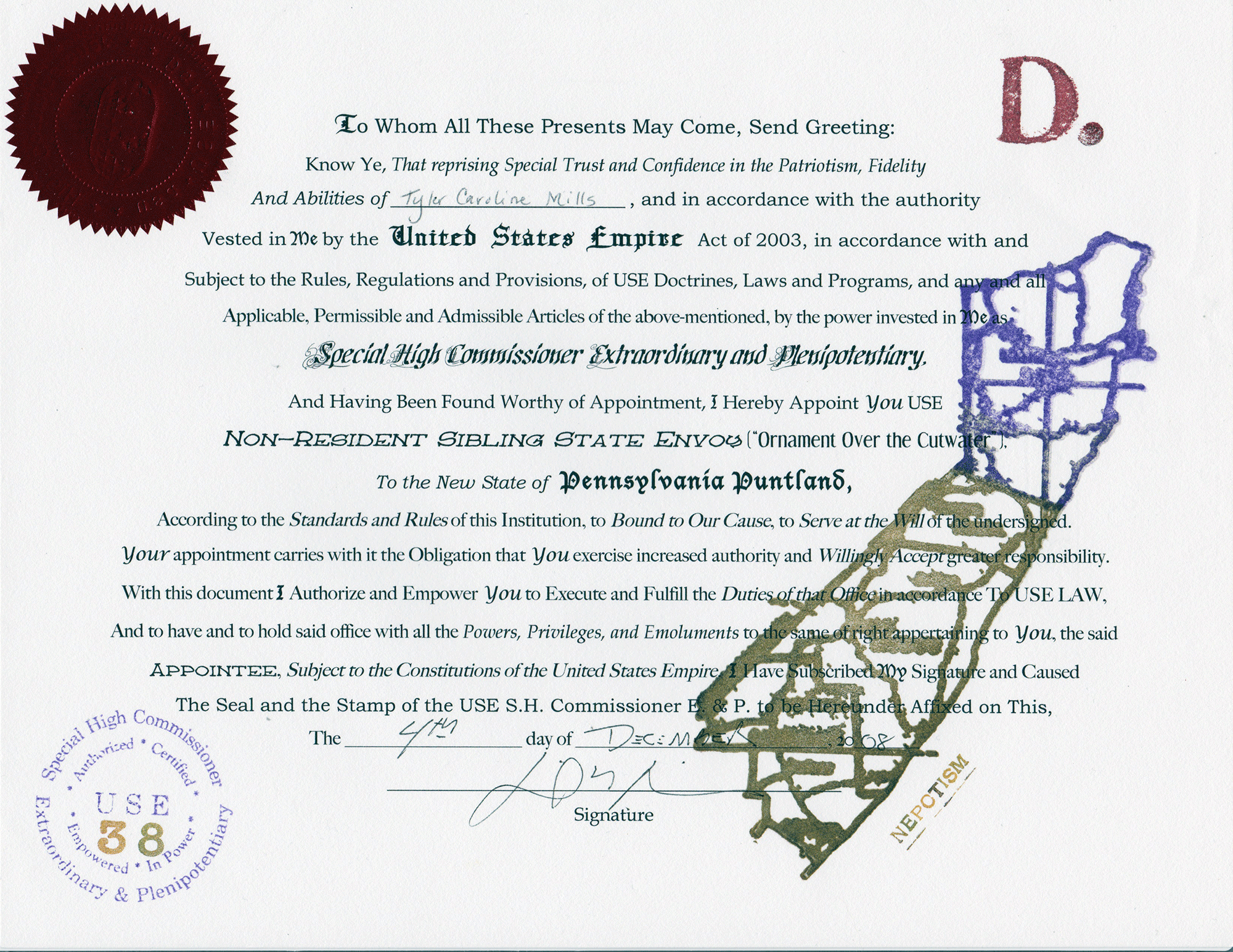 Beginning in 2008, Mills began to create an Ambassadorial apparatus for the United States Empire. He created a set of four Embassy positions for each new USE state, and awarded them to people connected in some way with his projects. Each Embassy appointee was mailed a certificate deploying official language culled from a variety of sources, ranging from documents created by the American Confederacy to diplomas in the Martial Arts. In keeping with the spirit of the whole enterprise, these awards are rife with nepotism and favoritism and positions are, of course, also for sale.