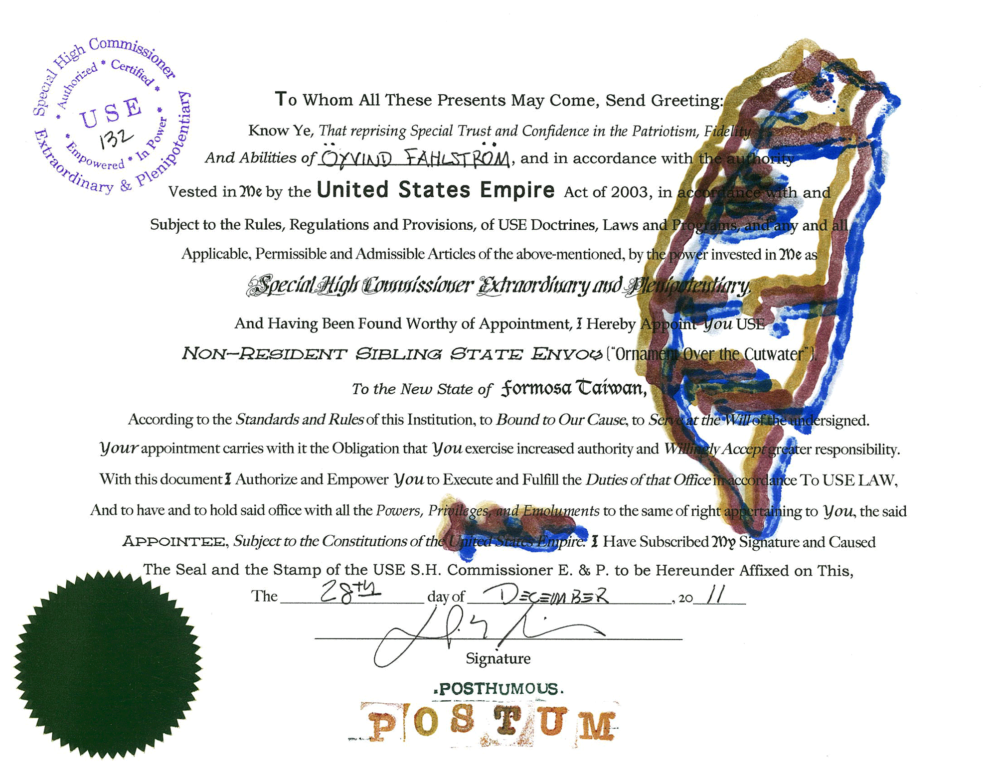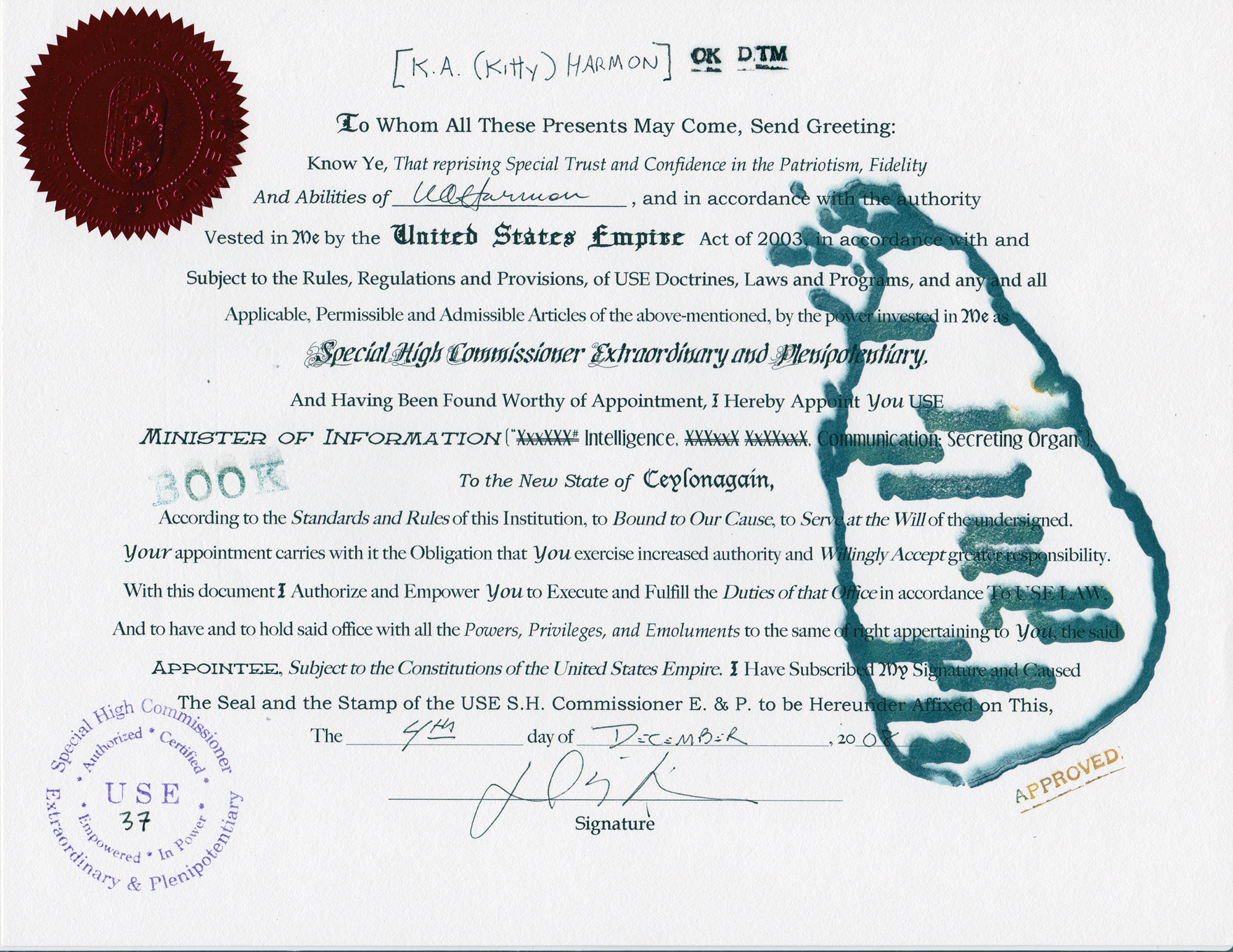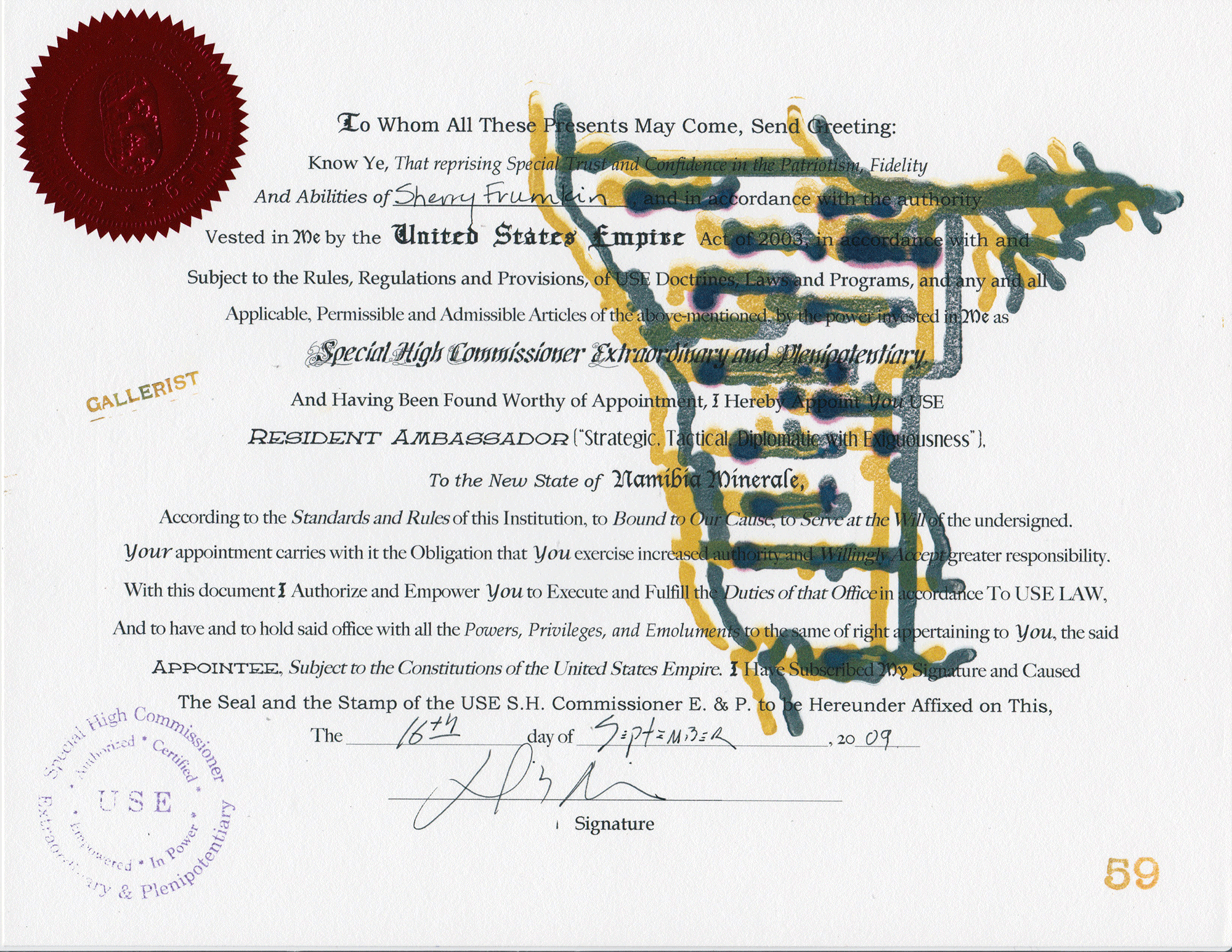 Beginning in 2008, Mills began to create an Ambassadorial apparatus for the United States Empire. He created a set of four Embassy positions for each new USE state, and awarded them to people connected in some way with his projects. Each Embassy appointee was mailed a certificate deploying official language culled from a variety of sources, ranging from documents created by the American Confederacy to diplomas in the Martial Arts. In keeping with the spirit of the whole enterprise, these awards are rife with nepotism and favoritism and positions are, of course, also for sale.