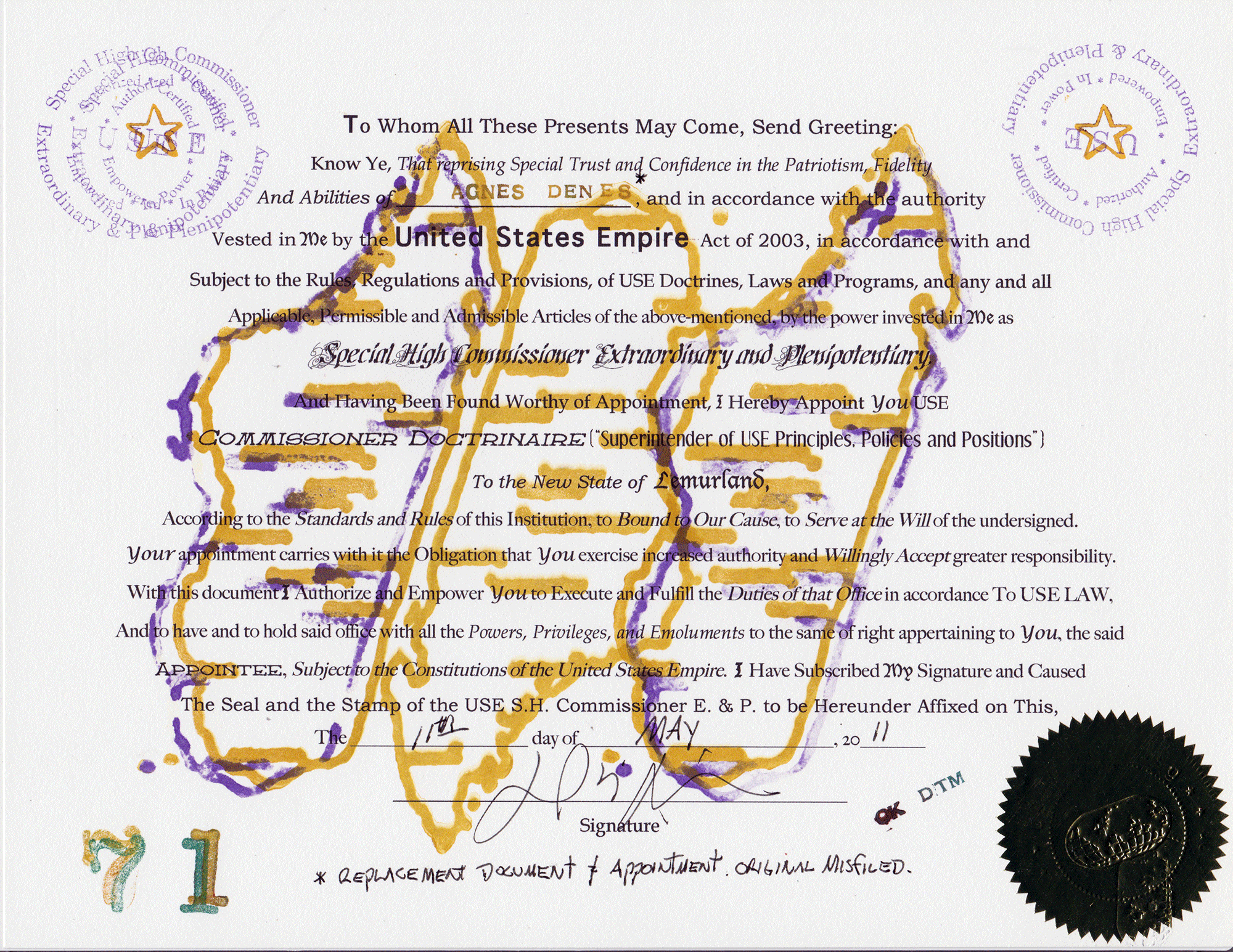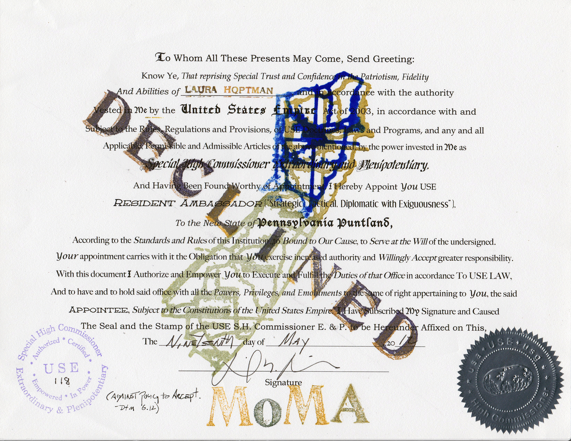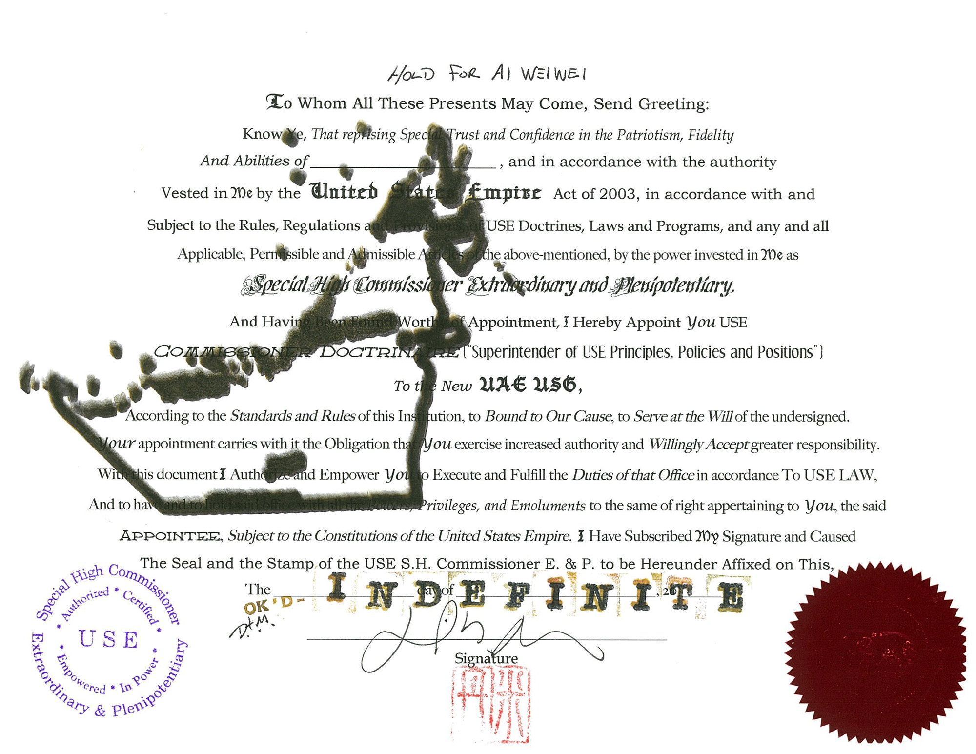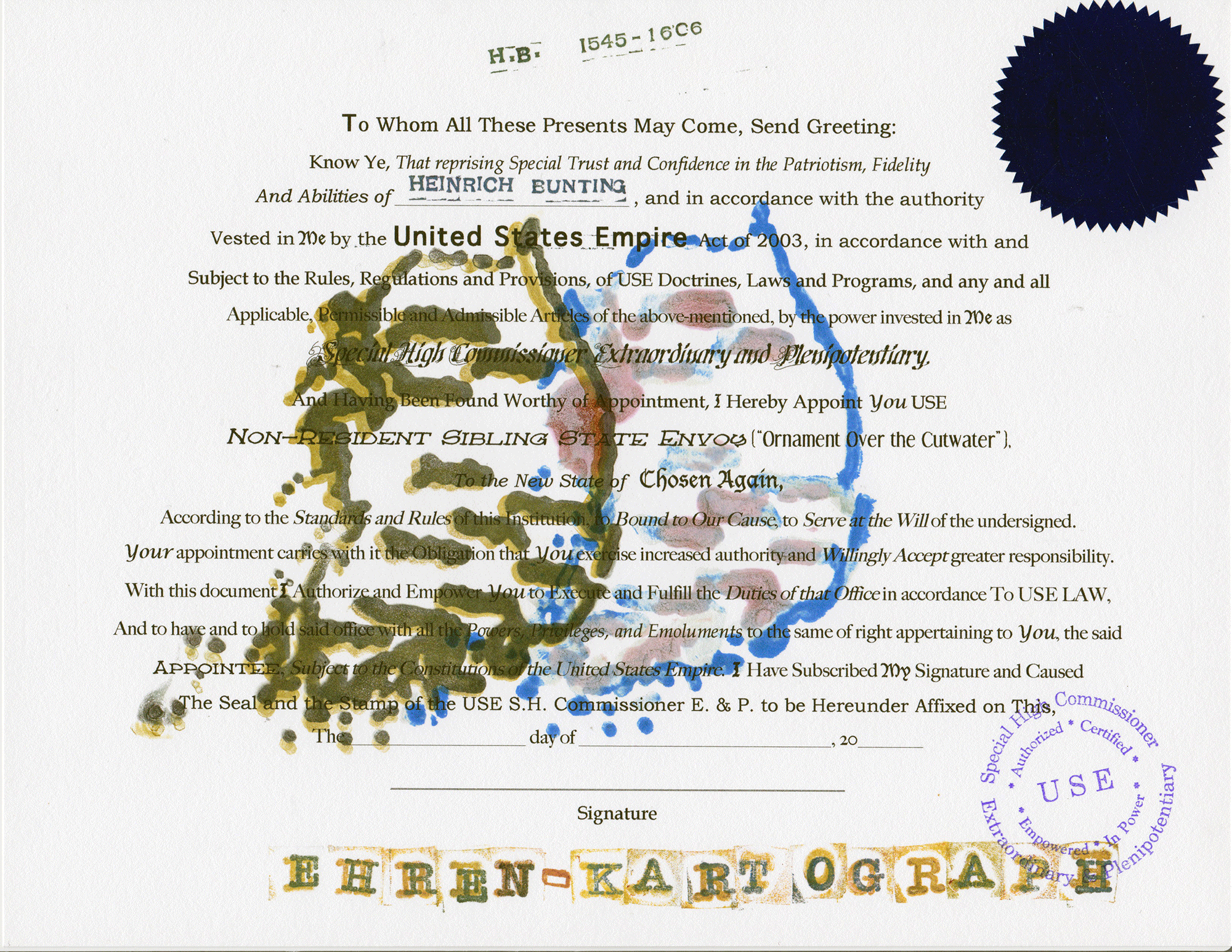 Beginning in 2008, Mills began to create an Ambassadorial apparatus for the United States Empire. He created a set of four Embassy positions for each new USE state, and awarded them to people connected in some way with his projects. Each Embassy appointee was mailed a certificate deploying official language culled from a variety of sources, ranging from documents created by the American Confederacy to diplomas in the Martial Arts. In keeping with the spirit of the whole enterprise, these awards are rife with nepotism and favoritism and positions are, of course, also for sale.